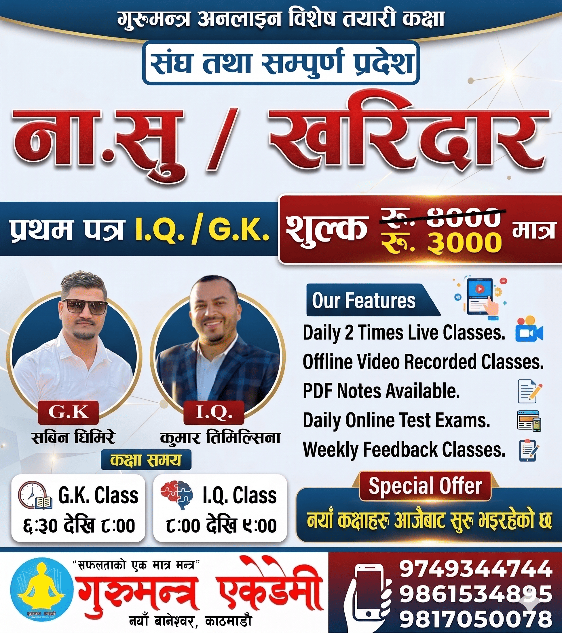 लोक सेवा आयोगको तयारी गरिरहनुभएका विद्यार्थीहरूका लागि गुरुमन्त्र एकेडेमीले नयाँ अनलाइन कक्षाहरू सञ्चालन गरिरहेको छ । गुणस्तरीय शिक्षा र उत्कृष्ट नतिजाको लागि आजै हाम्रो विशेष तयारी कक्षामा जोडिनुहोस् ।